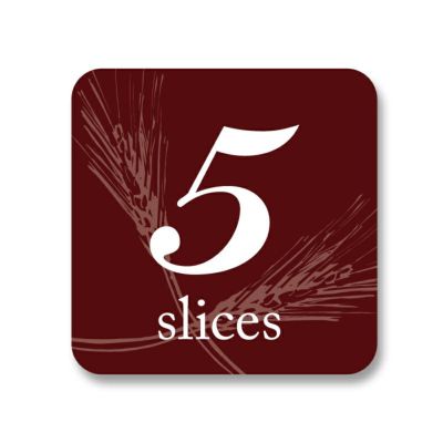 商品の特徴:食パンのスライス数表示専用のシールです。背景にうっすらと麦の穂をデザイン。5枚切用。●504枚入り(24枚×21シート)【印字内容】5slices