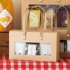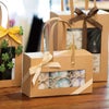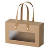 商品の特徴:商品を入れるだけでギフトが完成する、シンプルな無地の窓付ボックスです。ピンと立ったハンドルが手に取りやすく、店頭に並べてそのままお持ち帰りいただけます。