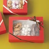 商品の特徴:フタの部分に大きな窓のついた、身ふた一体型のギフトボックスに赤色が登場!焼き菓子ギフトや衣料、雑貨などのギフトに。