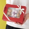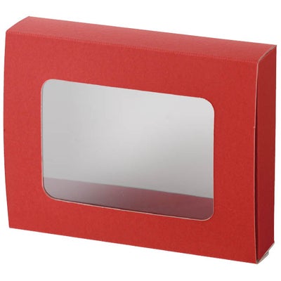 商品の特徴:フタの部分に大きな窓のついた、身ふた一体型のギフトボックスに赤色が登場!焼き菓子ギフトや衣料、雑貨などのギフトに。