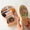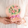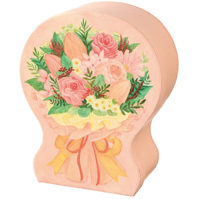 商品の特徴:色鉛筆と水彩絵の具で描いた、こだわりのデザイン貼箱です。色々な種類のお花がギュッと詰まった花束デザインと、色鉛筆の風合いが優しく可愛らしい印象のボックスです。花束のフォルムに型取ったダイカットの貼箱で、プレゼントを送る人にお菓子と合わせてお花も送っているような演出をしていただけます。