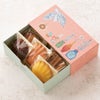 商品の特徴:イラストレーター 福田利之さんとのコラボレーション商品のギフト用貼箱です。福田さんの繊細なイラストをベースに、世界観にこだわった一つのアート作品のようなギフトボックスが完成しました。使いやすい四角いスリーブボックスタイプで、焼き菓子が映えるように引き出しの色にもこだわりました。天面のデザインが印象に残る素敵な貼箱です。
