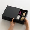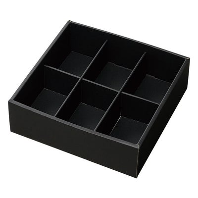 商品の特徴:ジャムや惣菜などの瓶が6つ入る仕切りが付いた黒のスリーブボックスです。セットの仕切は縦横共に倒してマスを拡張できるので、クラフトビールなどのボトルを入れてお使いいただくことも可能です。別売りの調節パーツを使うことで、様々なサイズの瓶に対応できる便利なギフトボックスです。スリーブ式なので身フタに段差が少なく包装紙もキレイに包むことができ、省スペースでギフト見本を展示できるのもポイントです。