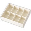 商品の特徴:ジャムや惣菜などの瓶が8つ入る仕切りが付いたオフホワイトのスリーブボックスです。セットの仕切は縦横共に倒してマスを拡張できるので、クラフトビールなどのボトルを入れてお使いいただくことも可能です。別売りの調節パーツを使うことで、様々なサイズの瓶に対応できる便利なギフトボックスです。スリーブ式なので身フタに段差が少なく包装紙もキレイに包むことができ、省スペースでギフト見本を展示できるのもポイントです。上品なオフホワイトは、合わせる掛け紙やリボンで高級ギフトにもナチュラルギフトにも変身し、様々なギフトシーンで活躍。お店のハンコやシールと組み合わせてオリジナル資材としてブランディングにご活用いただくのもおすすめです。