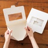 商品の特徴:無地ホワイトの天窓付き食品対応ボックスです。全面に耐油・耐水加工を施していますので、ドーナツや油分の多いパン、焼き立てのお菓子などを直接入れてお使いただけます。中の食品がより美しくおいしそうに見えるように天窓の大きさにこだわり、洗練されたシンプルさで商品を引き立てます。商品のおいしさと見た目のおいしさの両方をお客さまにお届けできるボックスです。清潔感のある無地ホワイトカラーは、シーズンやイベントを問わずオールシーズン活躍。お店のオリジナルシールやリボンなどと組み合わせて、ショップオリジナル資材のようにお使いいただくのもおすすめです。