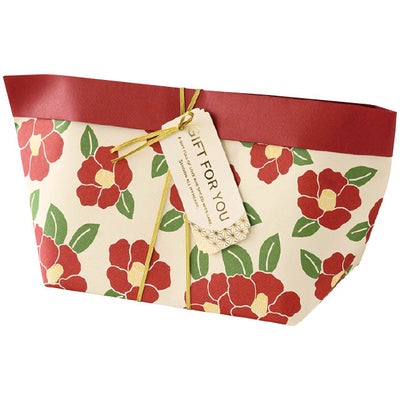 商品の特徴:大人気の舟形ペーパーバッグに、和モダンなテイストが登場!大柄の椿と紅色が華やかなデザインです。付属のゴムタッグを巻き付けてタグに引っかけるだけでギフトが簡単に完成!手早く簡単に作れるのでラッピングが苦手な方でも大丈夫。飾り小物との組み合わせに悩むこともありません。マドレーヌが6個程度キレイに入るサイズ感で、おしゃれな手土産にぴったりです。
