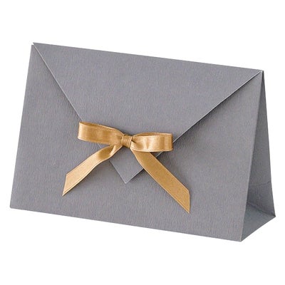商品の特徴:付属のリボンを付けるだけで簡単にラッピングが完成する、チャコールのマチ付き封筒型ギフト用紙袋です。小さめサイズで、アクセサリーなどの小物をラッピングににもおすすめ。エレガントな無地のチャコールにゴールドのリボンをあしらったのシンプルなデザインは、お店のシールなどを加えると店舗オリジナルラッピング資材としても活躍します。