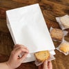 商品の特徴:晒(さらし)クラフト紙製の白の無地角底ペーパーバッグ(紙袋)です。シンプルな白無地でサイズ展開もあるので、幅広い業種の店舗様にお使いいただける角底袋です。