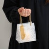 商品の特徴:市松柄に金色の和柄のデザインが高級感を感じさせるハンドル付キューブバッグです。半透明のフロストタイプなので中身がうっすらと透けて上品に見せてくれます。裏面は市松柄のみのスッキリとしたデザインなので、シールなど小物をあしらっていただくと異なる表情を楽しめます。焼き菓子が4個、どら焼きが2個程度入るお手頃なサイズ感もポイント。自家用やプチギフトなど、お手軽ギフトラッピングにおすすめのギフトバッグです。