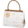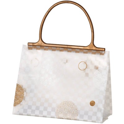 商品の特徴:白の市松柄に青海波や麻の葉などの和柄デザインをあしらったハンドル付ギフトバッグです。半透明のフロストタイプなので中身がうっすらと透けて上品に見せてくれます。ハンドルの凹凸でバッグの口を閉じられるので、端処理も要らず作り置きにも便利。上品で和モダンなデザインは、和菓子にはもちろん、抹茶やほうじ茶を使用した和テイストな焼菓子にもおすすめ。表裏でデザインが違うので、それぞれ異なる表情を楽しめるのもポイントです。焼き菓子が6個、どら焼きが4個程度入るお手頃なサイズ感で、自家用やプチギフトなどのお手軽セットギフトにぴったりのギフトバッグです。