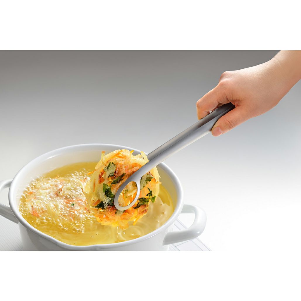 備考:大きな穴が開いているので、揚げ物の油切れもよく、つかみやすいです。特許取得のバネ構造と開き角度にこだわり、やわらかな使い心地を実現しました。