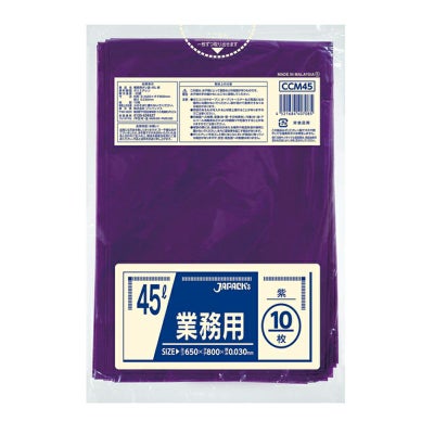 商品の特徴:45Lサイズの紫色ゴミ袋。柔軟性に優れ、伸びに強く突起物にも強い。