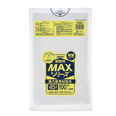 商品の特徴:45Lサイズの半透明ゴミ袋。引張りに強く、柔軟性も兼ね備えている。徳用タイプ。