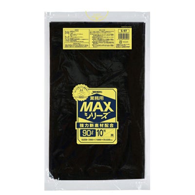 商品の特徴:90Lサイズの黒色ゴミ袋。引張りに強く、柔軟性も兼ね備えている。