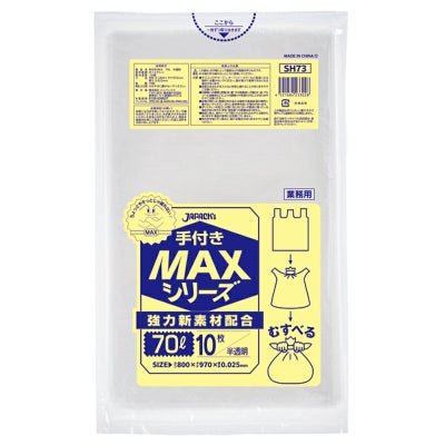 商品の特徴:70Lサイズの半透明ゴミ袋。縦寸を長くして入る容量アップ、結びやすくて、持ち運びにも便利な手付き。