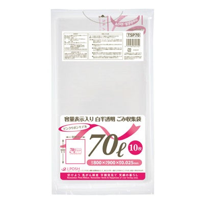 商品の特徴:引張り強度に優れた容量(サイズ)表示付き70Lサイズのポリ袋。ピンクリボンモデル。