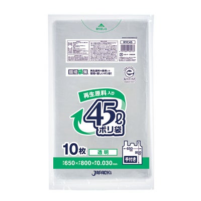 商品の特徴:環境にやさしい再生原料40%使用ポリ袋(エコマーク付き)。45Lサイズ透明。手付きタイプ。