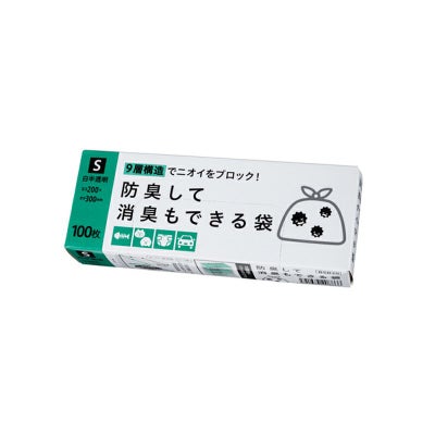 商品の特徴:9層構造の防臭+消臭ポリ袋。箱タイプ。硫化水素ガス(生ゴミ・排泄物・タバコ臭)の消臭試験結果で24時間で約99%以上消臭効果が実証。防臭効果も24時間でにおいバリア率96%以上。