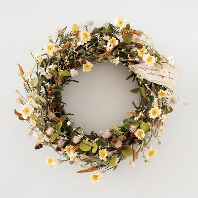 商品の特徴:ドライフラワーのようなナチュラルな風合いと色で、かざるだけで空間演出ができる造花のリースです。造花にはワイヤーが入っているので、お好みの咲き方に整えていただけます。お店の雰囲気出しや、おもてなしの空間を演出するのにぜひご利用ください。