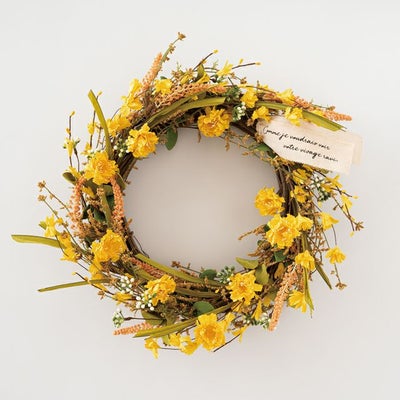 商品の特徴:ドライフラワーのようなナチュラルな風合いと色で、かざるだけで空間演出ができる造花のリースです。造花にはワイヤーが入っているので、お好みの咲き方に整えていただけます。お店の雰囲気出しや、おもてなしの空間を演出するのにぜひご利用ください。