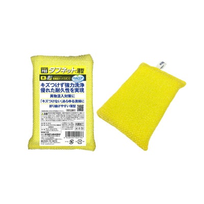 商品の特徴:高耐久ネットスポンジ。器物にキズを付けずに汚れをしっかりとかき落とします。薄型なので折り曲げやすい。4色のカラー展開。