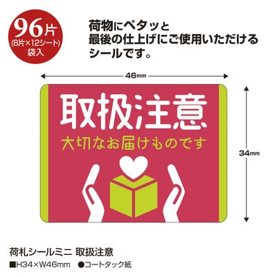 商品の特徴:運送業者の方へ取り扱いの注意喚起に役立つ荷札シールです。小さい箱や封筒にピッタリなミニサイズです。荷物に貼るだけで、送り主の「想い」を伝えることができます。1冊96片入です。