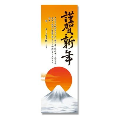 年末・年始の店舗休業時に、仕事始めの日程を告知する賀正ポスターです。富士山に昇る初日の出が神々しく日本のお正月を演出してくれます。【印字内容】謹賀新年 旧年中は格別のお引立に預かり厚く御礼申し上げます。本年も何卒ご愛顧の程よろしくお願い申し上げます。元旦 尚、○日より営業致します。