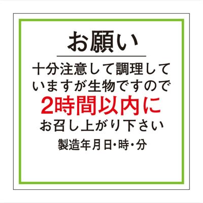 商品の特徴:食品スーパー店頭での生鮮品・惣菜などの製造内容表示に最適なシールです。プライスカードや値札、商品本体などに貼り付けてご使用ください。他にも異なる字句・デザインのラベルシリーズをご用意しておりますので、ご使用シーンに合わせてお使いください。