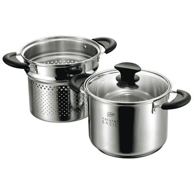 材質:本体:18-8ステンレス(0.6mm) 底部:アルミニウム(2.5mm)・18-0ステンレス(0.5mm) 蓋:強化ガラス ハンドル・ツマミ:フェノール樹脂 中かご:18-8ステンレス(0.6mm)