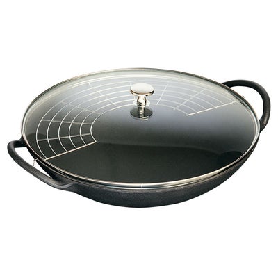 ●口径が広く、お料理が見えやすく、サーブしやすいです。蓋がガラスなので、軽く開け閉めに負担が無く、中の料理が見えます。ビュッフェに最適なストウブ。