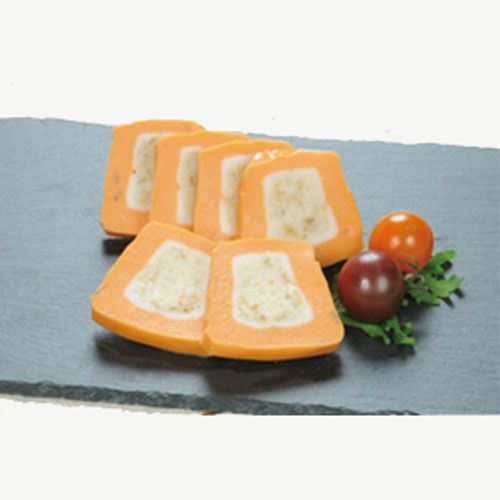 芯にサーモンを使用した市松かまぼこを鶏肉でロールした和風味の一品です。オードブルやおせち商材にご使用下さい。
