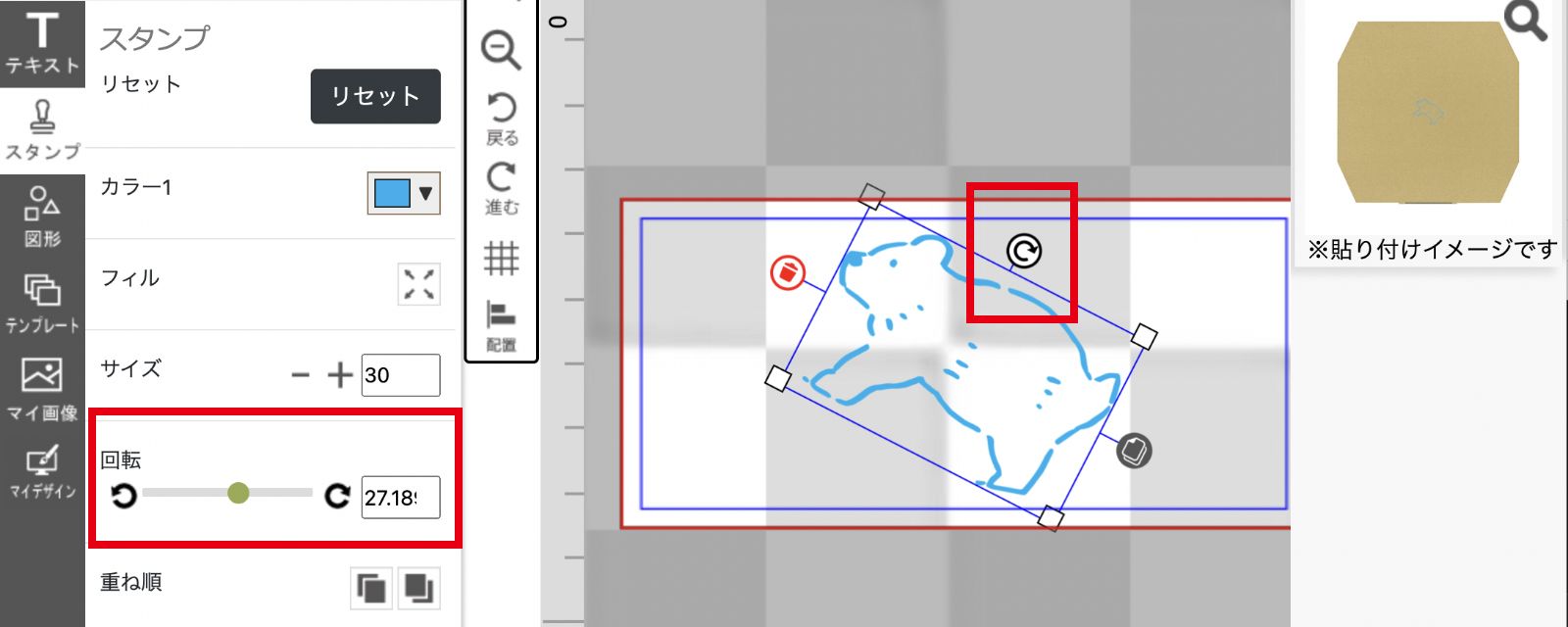 「回転」または画面上のカーソルで回転させることができます。